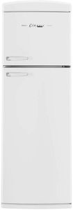 Timeless style meets efficiency in our 11 cu. ft. retro top-mount, Energy Star, frost-free refrigerator. Featuring chrome accents, LED display, adjustable glass shelves, frost-free cooling and Super Freeze Mode, it blends style with performance. Stay organized with a wine rack, ice tray, and humidity control crisper while the digital control panel and door alarm ensure convenience and peace of mind.Read More