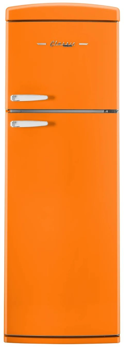 Timeless style meets efficiency in our 11 cu. ft. retro top-mount, Energy Star, frost-free refrigerator. Featuring chrome accents, LED display, adjustable glass shelves, frost-free cooling and Super Freeze Mode, it blends style with performance. Stay organized with a wine rack, ice tray, and humidity control crisper while the digital control panel and door alarm ensure convenience and peace of mind.Read More