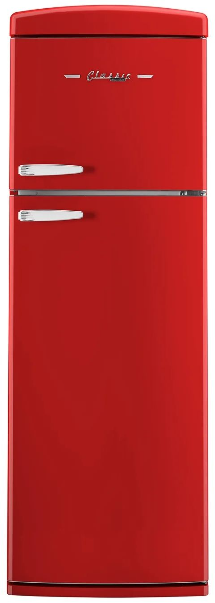 Timeless style meets efficiency in our 11 cu. ft. retro top-mount, Energy Star, frost-free refrigerator. Featuring chrome accents, LED display, adjustable glass shelves, frost-free cooling and Super Freeze Mode, it blends style with performance. Stay organized with a wine rack, ice tray, and humidity control crisper while the digital control panel and door alarm ensure convenience and peace of mind.Read More
